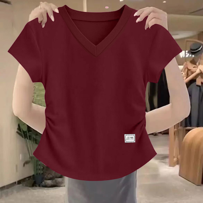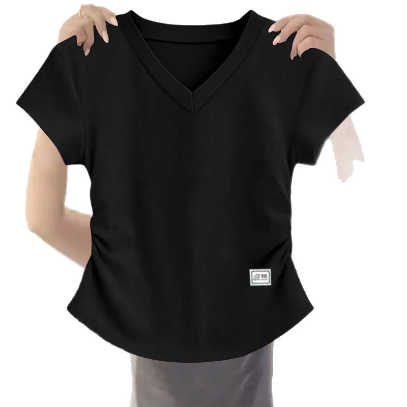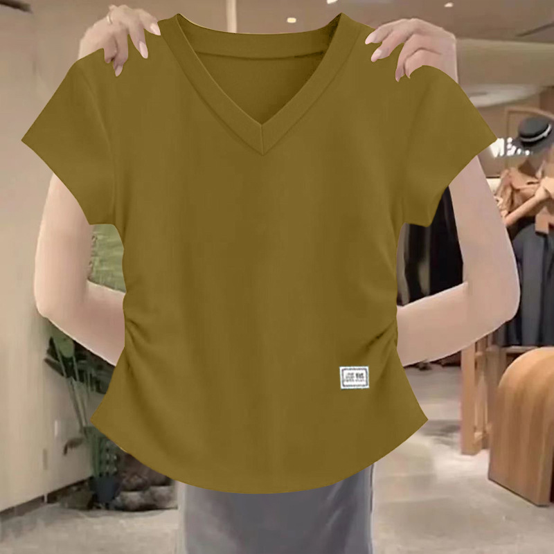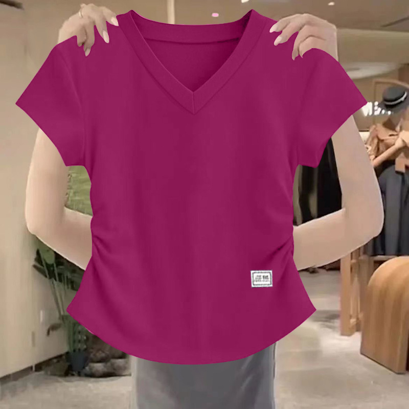 2025 새로운 패션 주름 v 넥 반팔 티셔츠 여성 플러스 사이즈 여름 착용 단순 루즈 다용도 디자인 탑