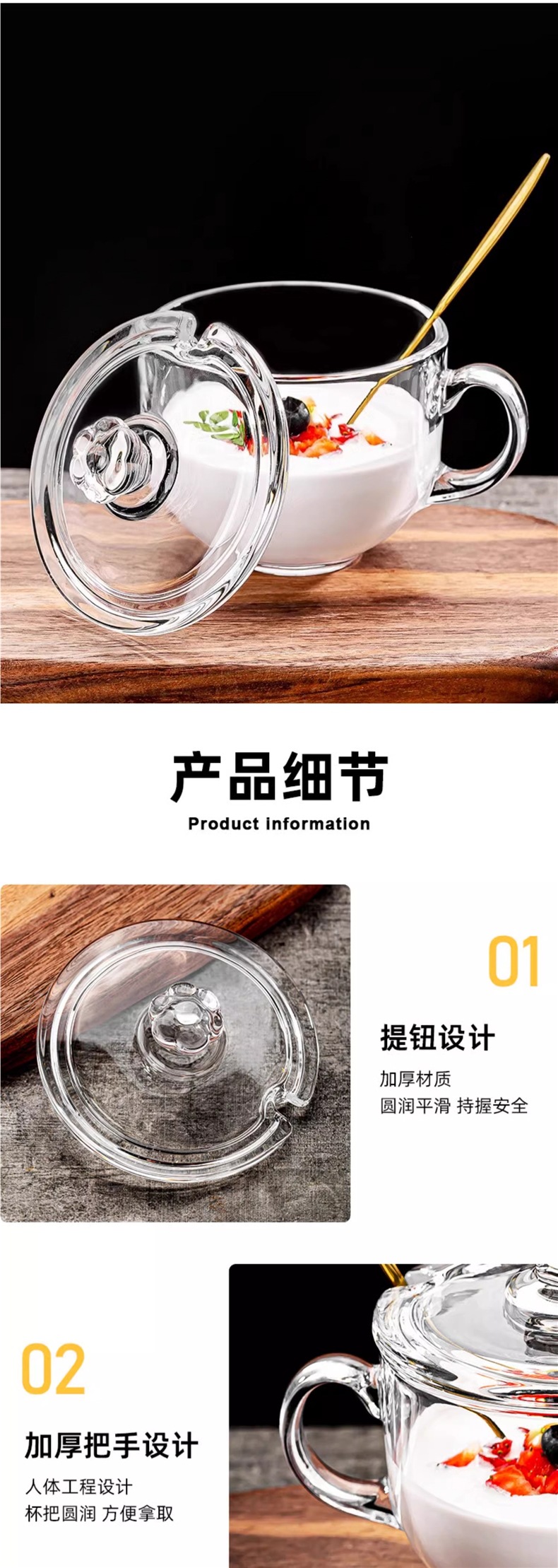 470ml无铅早餐杯(2只)+玻璃盖(2只)+金色勺子(2只)