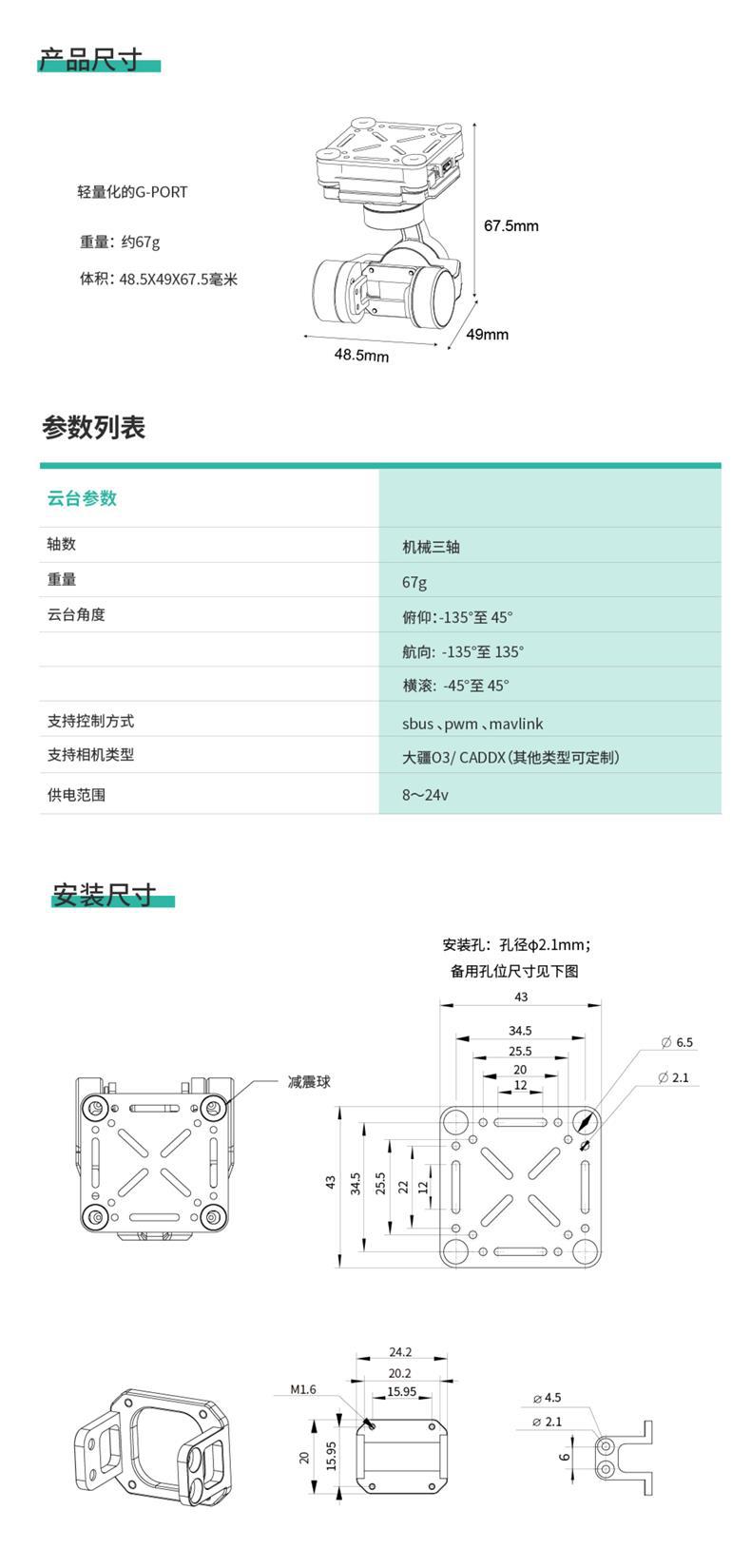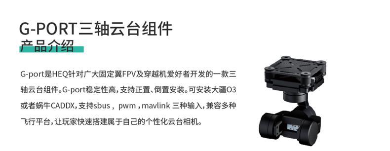 G-PORT 3축 짐벌 어셈블리는 DJI O3 스카이 엔드 및 CADDX 카메라 트래버스 머신, FPV를 장착할 수 있습니다.