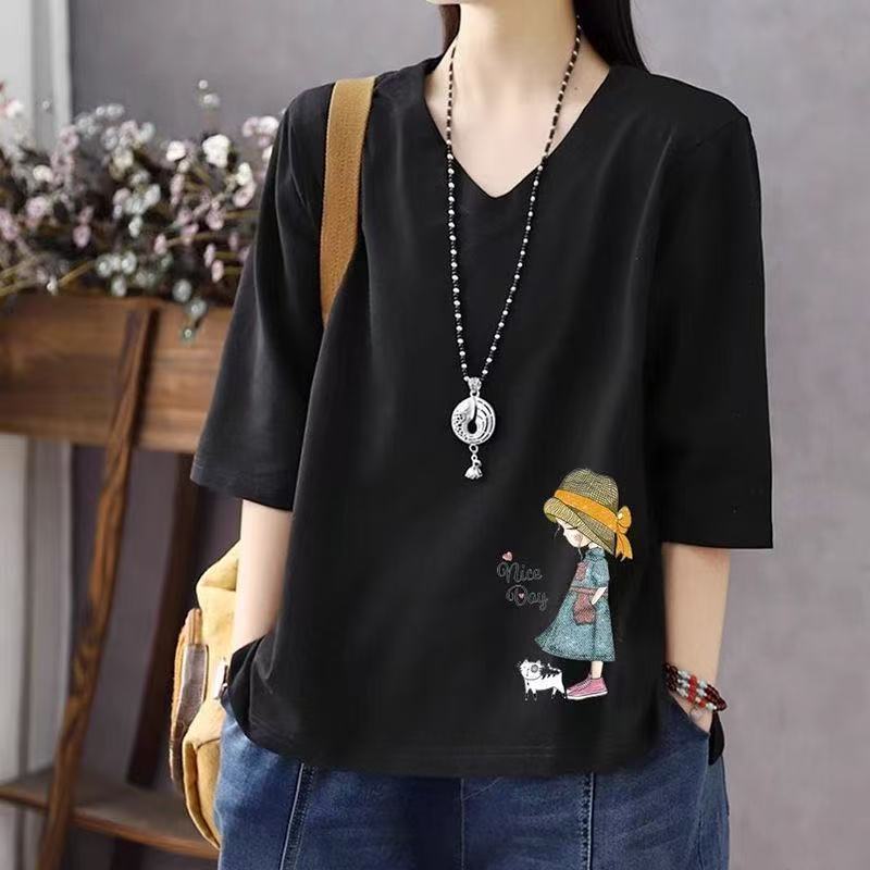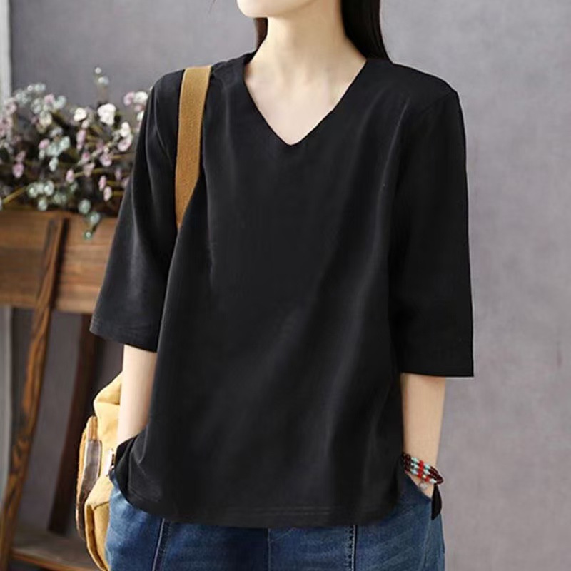 7부소매 하의 2025 신상 여름 스타일 루즈하고 슬림하며 스타일리시하고 활용도가 높은 탑 플러스 사이즈 브이넥 여성 티셔츠