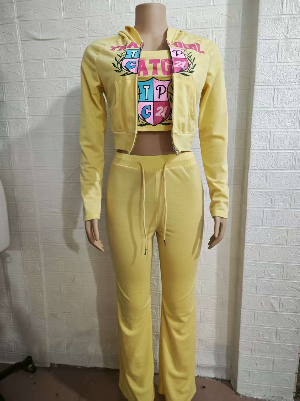 국경을 넘나드는 유럽과 미국 스타일의 섹시한 신축성 있는 허리 스웨트셔츠와 바지, 편안한 캐주얼 스포츠 스타일 슈트, 여성용 3피스 슈트