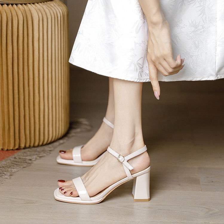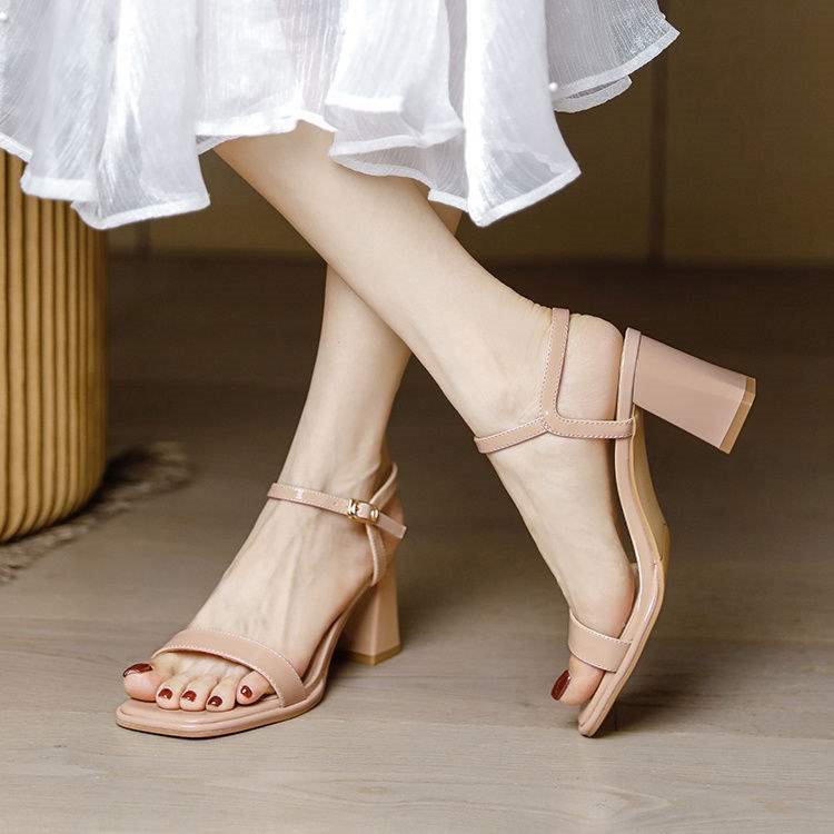 여성용 누드 핑크 하이힐, 두꺼운 굽, 심플하고 부드러운 요정 스타일, 스커트, 오픈 토우 스퀘어 토 샌들, 여성용 여름