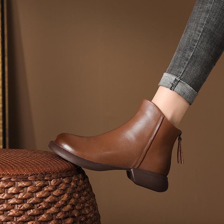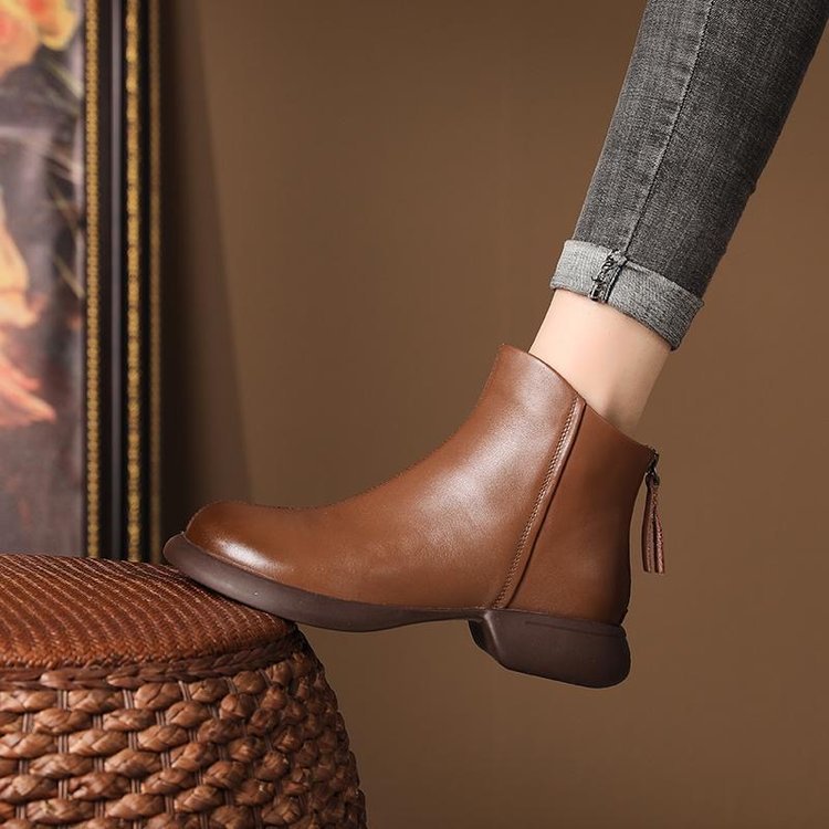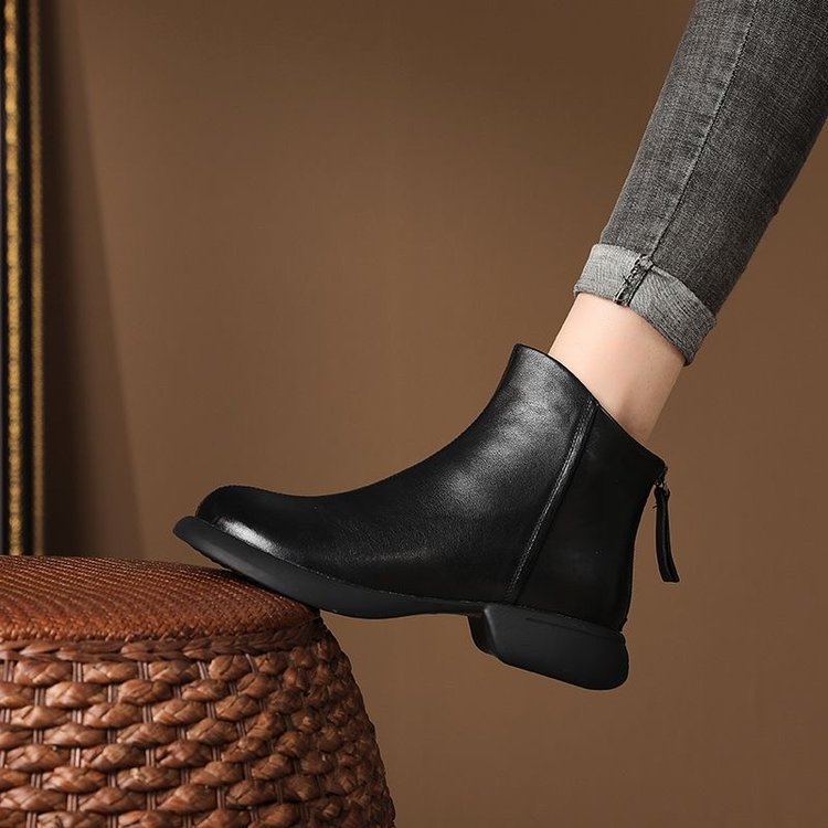 여성을위한 부드러운 가죽 복고풍 스타일 짧은 부츠 2025 가을, 겨울 새로운 스타일 뒤 지퍼 여성 부츠 여성을위한 미끄럼 방지 부드러운 바닥 플러스 벨벳 마틴 부츠
